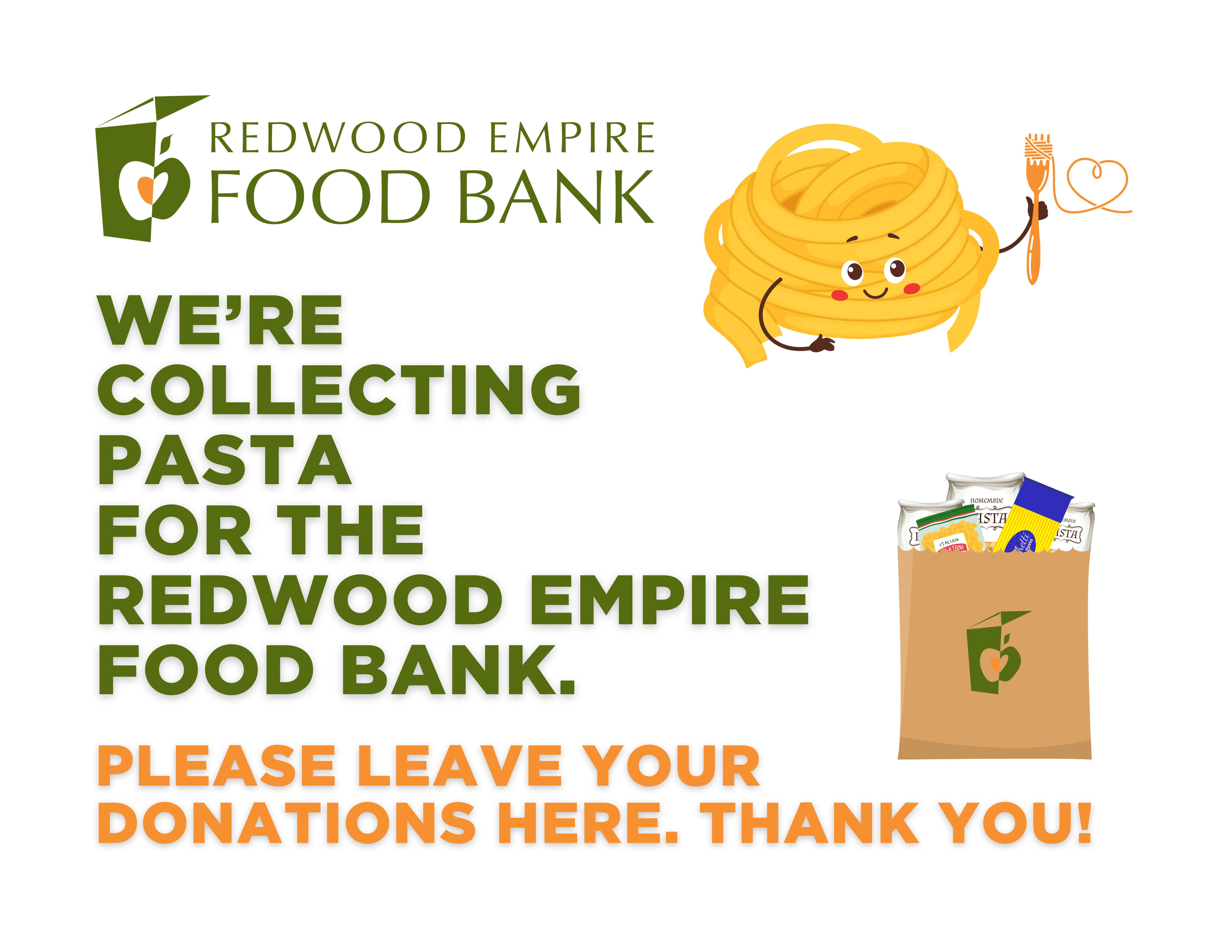 Ways to donate pasta: Host a Ding-Dong Donate neighborhood food drive; Host a food barrel; Drop off donations directly to Redwood Empire Food Bank or to a participating grocery store like Oliver's or Whole Foods; Host a virtual food drive: for every $1 donated, we can distribute $3 worth of food.
