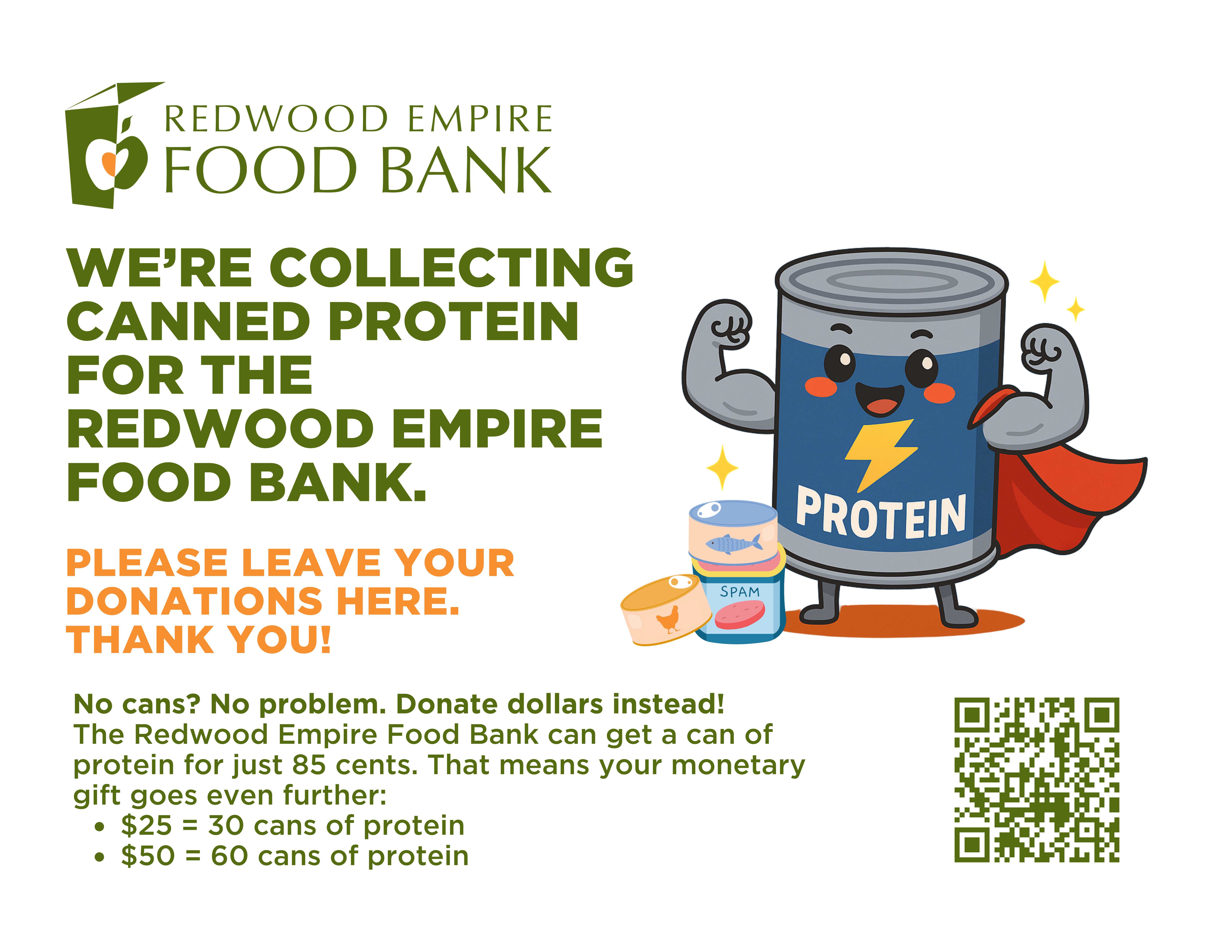No cans? No problem—donate dollars instead! The Redwood Empire Food Bank can get a can of protein for just 85 cents. That means your monetary gift goes even further.